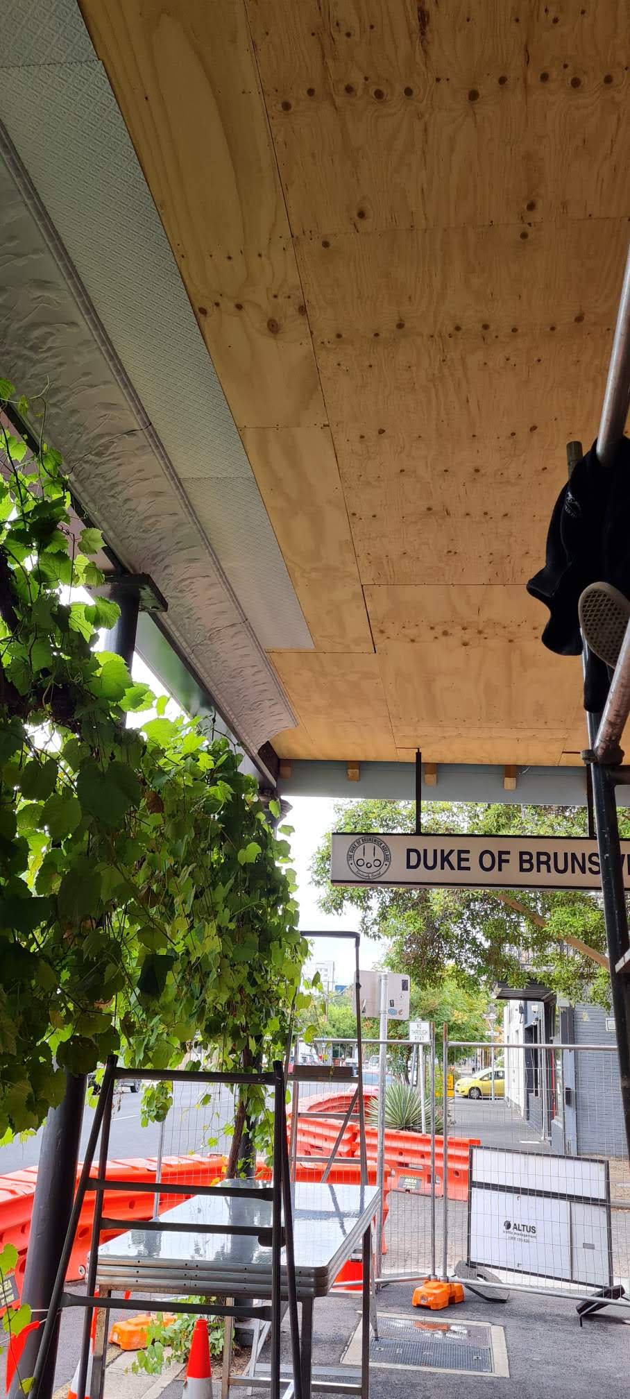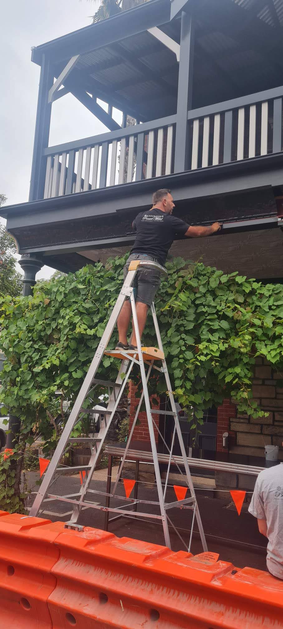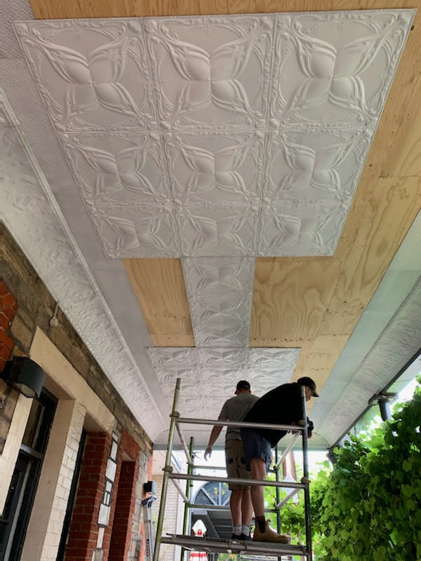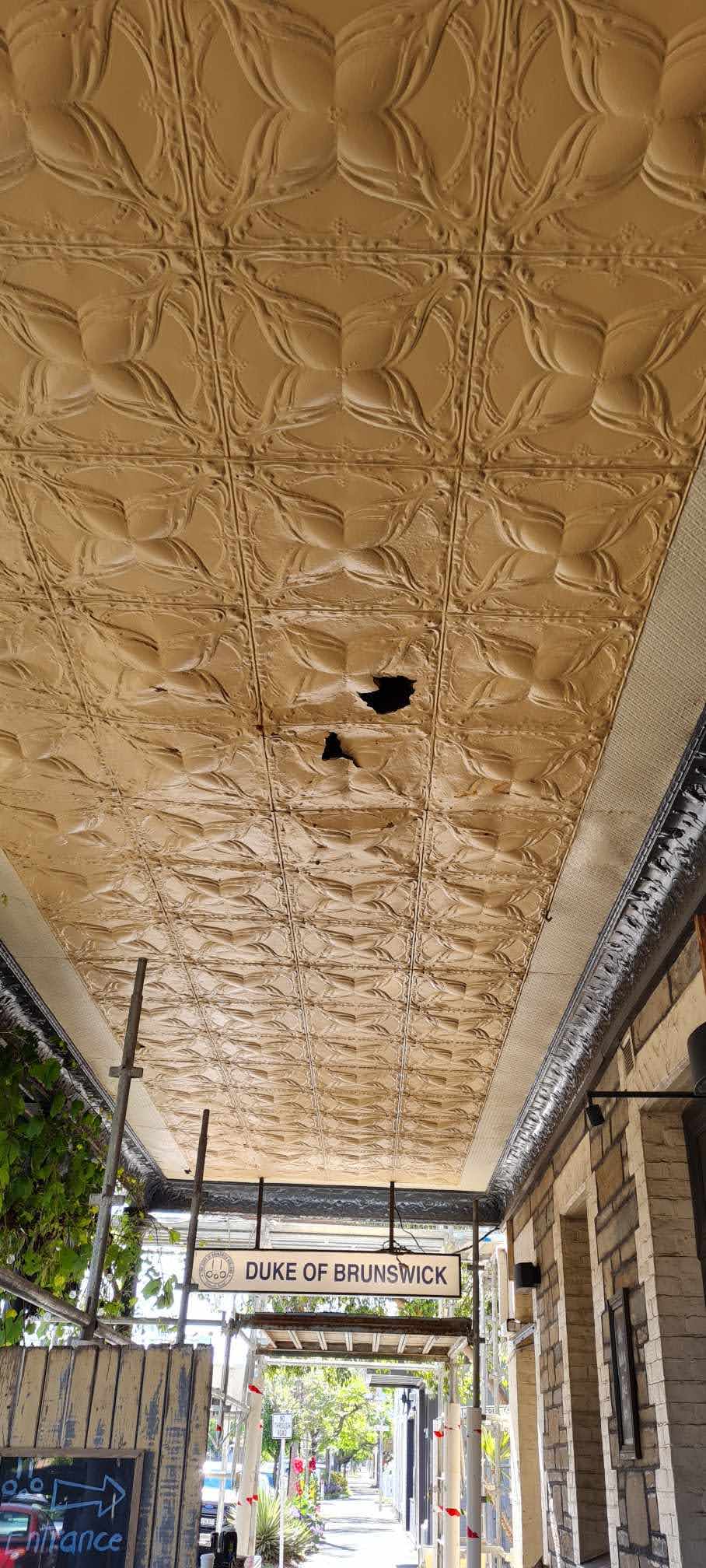 Project DescriptionAdelaide Pressed Metal worked closely with Heritage Architects, BB Architects, on the refurbishment and restoration of the verandah awning on the Duke of Brunswick Hotel in Gilbert Street Adelaide. The existing pressed metal on the verandah ceiling and the cornice was badly damaged and rusted beyond repair. The original pressed metal designs were readily available and in production through Adelaide Pressed Metal, however with the original cornice a new die was required. This was achieved by using an original piece of the cornice that was in good repair and a new die was created from this, completed with matching mitres. The cornice recreated was the 'Poppy' cornice a large and dramatic cornice with a profile of 400mm. The 'Charlton' design was installed to the verandah ceiling bordrered by the 'Carlton' border design, all panels were etch primed ready to be painted and were installed over a substrate of marine grade ply installed by the builder. Adelaide Pressed Metal completed the project with final painting of the verandah and cornice facade to colours specified by the Heritage Architect.