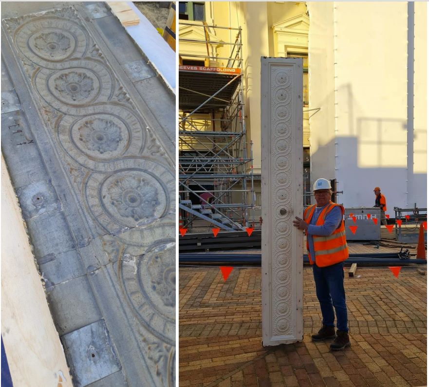 Project DescriptionAUDITORIUM STAGE 1. Demolition of the pressed metal ceiling under the dress circle with panels salvaged for future reinstalment. Repair & restoration of pressed metal Auditorium ceiling. The Wellington Town Hall is a Category 1 historic place on New Zealand's heritage list. The heritage architect report required authentic & sympathetic restoration of the original pressed metal ceiling in the Auditorium, circa 1904. National Pressed metal was the nominated contractor due to their expertise & extensive experience working on large scale restoration projects. Major restoration and repair works were carried out by National Pressed Metal and the teams from Melbourne Pressed Metal, Adelaide Pressed Metal & Stamp Pressed Metal for the Australian Pressed Metal Group on the Wellington Town Hall Auditorium ceiling in Wellington New Zealand. Works started in early 2020 & due to the pandemic stage 1 was completed in September 2024. Through this time National Pressed Metal worked closely with the builder & heritage architect to keep progress moving ahead through the challenges of lock downs, material shortages, flight restrictions & timeline extensions. The highly experienced National Pressed Metal teams were contracted to restore & repair the pressed metal ceiling to original condition, working closely with heritage architects & builder Naylor Love. A section of the original pressed metal ceiling in the Auditorium was carefully removed to give crane access for work on the seismic structural steel beams to be installed, asbestos removal & fire sprinkler system installation. Construction of a trapeze trampoline scaffold (wall hung only) for ceiling works, was installed allowing the original pressed metal panels to be meticulously unpicked & carefully reinstalled once repairs & restoration work was completed, for a seamless finish done to perfection. Deterioration of the original ceiling panels, damage & inferior patching & repair works over the previous century required a team with expertise, skill & knowledge of the pressed metal elements & their installation. Two new dies were created - Botanica & Bodkin, as the designs were not in production. These designs were pressed in premium O Grade aluminium to the original imperial measurements & fit in seamlessly where repairs & replacement panels were required. The original Celtic beams that followed the curve of the ceiling had been damaged & portions removed over the years for lighting & anchor points for speaker trusses. New unobtrusive anchor points were designed off the wall. The Celtic beams were reproduced from soft zinc to be malleable & curvable then carefully repaired & replaced in damaged areas. Fire services were updated with sprinkler head systems installed to bring the building up to code. The position of the sprinkler heads were mathematically calculated to be aesthetically pleasing & unobtrusive with penetrations placed in the Celtic Beams. Original pressed metal roses were repaired & restored & the original vents were replaced using the Victorian Vent Perforated panel with the perforations hand punched.
