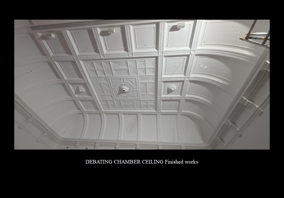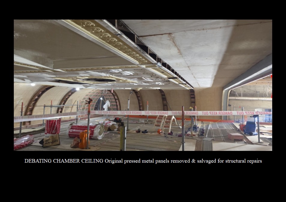 Scope of Contracting WorksDEBATING CHAMBER : Major seismic strengthening works required the construction of an 800mm-thick reinforced concrete wall, altering the Debating Chamber ceiling's curve radius. This necessitated complete removal & salvage of the original curved Fleur ceiling panels & Beam cladding. Reinstatement of the original Fleur panels & replacement panels required precise hand scribing to match the newly altered curvature. LANTERN CEILING: All original pressed metal panels were removed, cleaned, labelled & reinstated after replacement of rotted roof timbers & upgrades to mechanical & fire systems.
