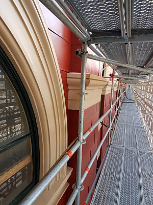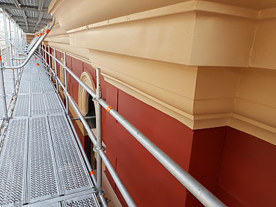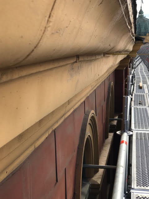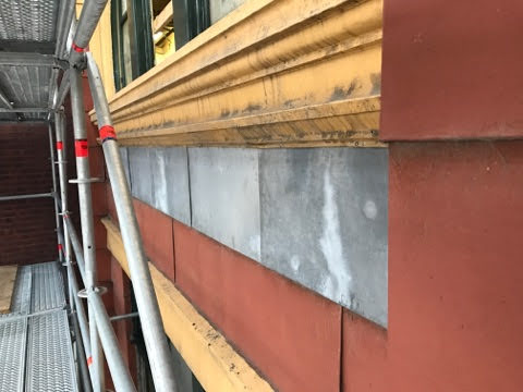 Scope of Contracting WorksExtensive repair and restoration of pressed metal elements including metal shingle cladding, 14 vent stacks repaired using soft zinc, installation of lead flashing, penetrations under verandah for rain heads.