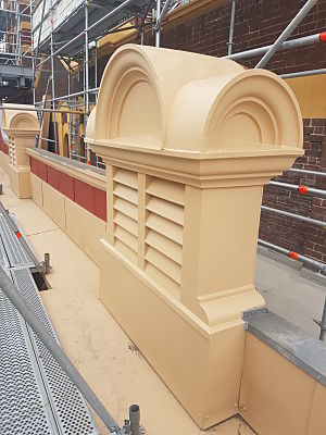 Project DescriptionExtensive repair and restoration works were carried out on the platform side of Flinders Street Train Station by National Pressed Metal, contracting arm of the Australian Pressed Metal Group. Teams from Melbourne Pressed Metal and Adelaide Pressed Metal worked closely with builder BUILT to restore the platform fascade to its original impressive condition. The majority of the overall restoration works of Flinders Street Train Station was completed on the platform side of the building. Original metal shingles on the fascade were repaired and restored as well as original metal arches, capitals and sills. 14 original metal vent stacks were also repaired and restored using soft zinc to keep the authentic heritage fabric of the building. Continuation of the replacement of 350 metres of lead flashing was also installed along the the platform fascade. Penetrations under the platform verandahs were also cut to allow for rain heads installation.
