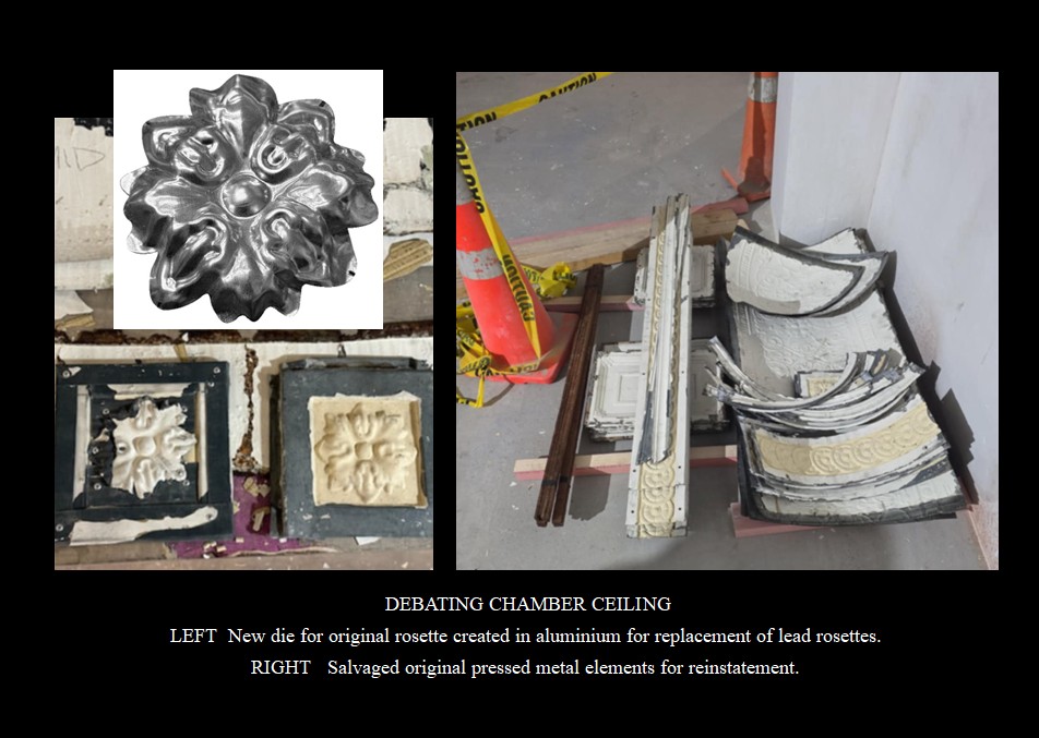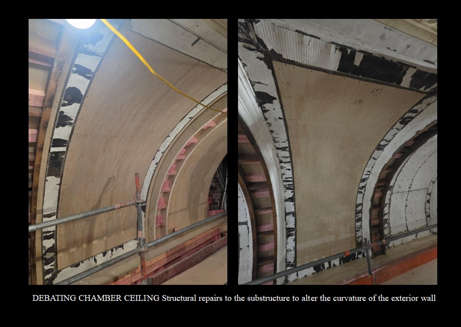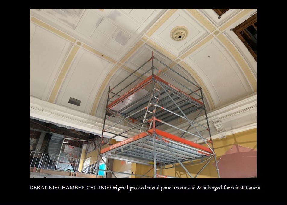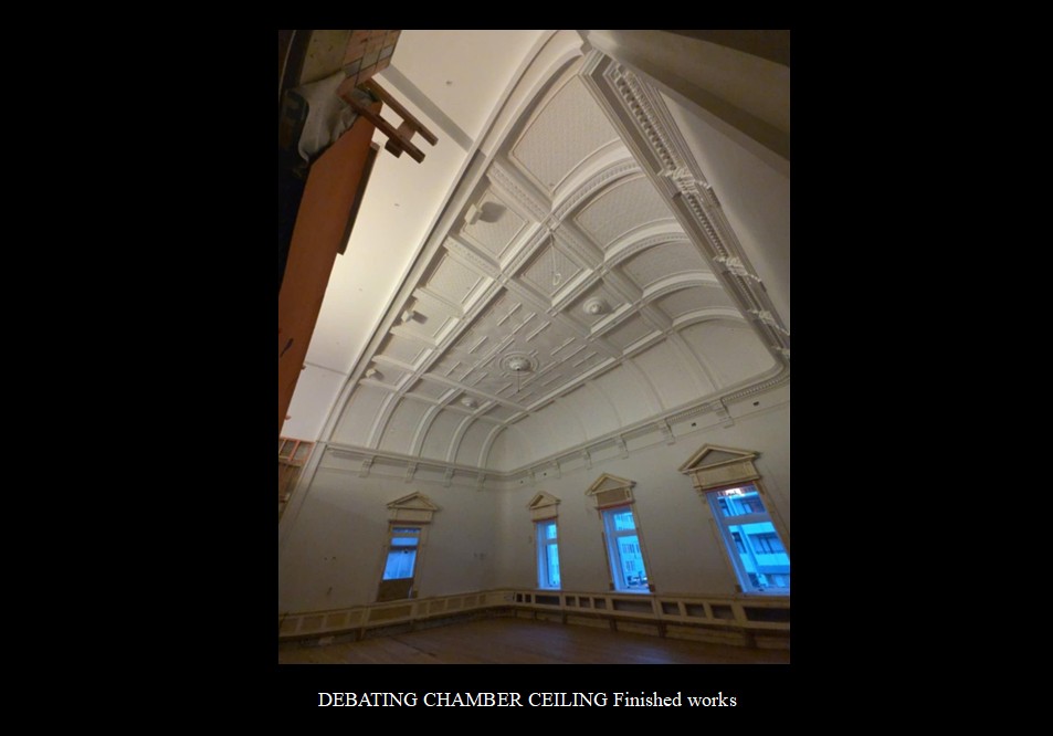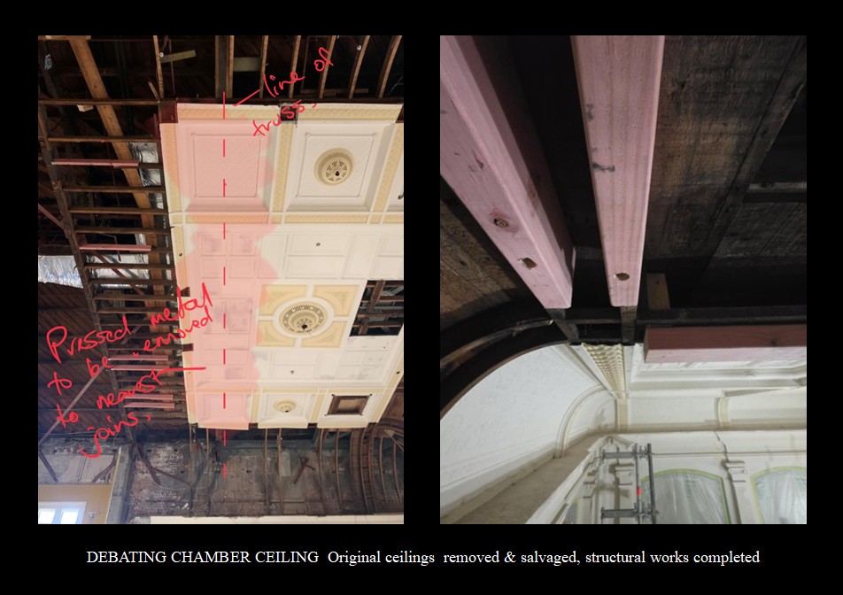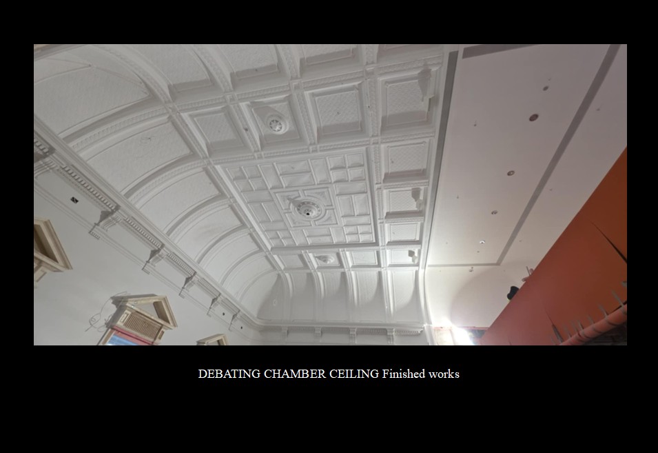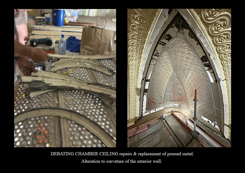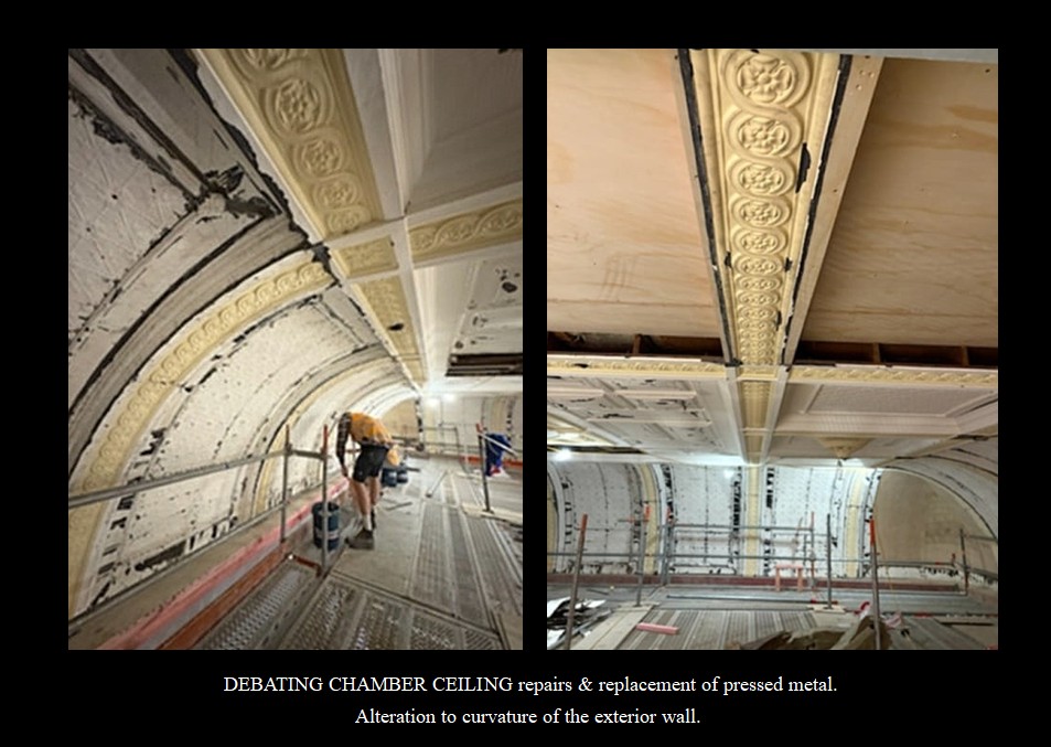 Scope of Contracting WorksDEBATING CHAMBER : Major seismic strengthening works required the construction of an 800mm-thick reinforced concrete wall, altering the Debating Chamber ceiling's curve radius. This necessitated complete removal & salvage of the original curved Fleur ceiling panels & Beam cladding. Reinstatement of the original Fleur panels & replacement panels required precise hand scribing to match the newly altered curvature. LANTERN CEILING: All original pressed metal panels were removed, cleaned, labelled & reinstated after replacement of rotted roof timbers & upgrades to mechanical & fire systems.