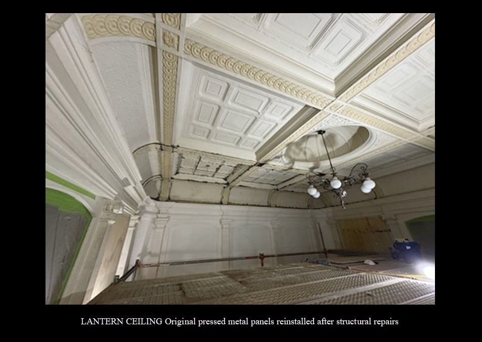Project DescriptionDEBATING CHAMBER : Major structural works were needed in the Debating Chamber to stabilize the exterior wall for earthquake proofing. The stabilizing of the wall included reinforcing the wall with concrete up to 800mm thick which moved the wall into the existing footprint of the building, altering the substructure timber framing & ultimately changing the curve radius of the exterior wall while the internal side walls remained the same. Use of a mobile scaffold was required to unpick all of the original curved ceiling panels in the Fleur design. The Beam Cladding was also unpicked & removed to allow for fire service sprinklers to be installed. During the unpicking stage it was discovered that the Flower Boss & P Round Rail on the beams were replicated in lead, estimated to have been done in the 60's to replace the damaged Flower Boss & Rails. Due to the weight of these lead elements being a safety issue if they fell from heights, they were removed & reproduced in soft zinc before being reinstated. Damaged sections of the Beam Cladding were replaced using 6'' Beam Cladding from the Australian Pressed Metal catalogue. After being carefully unpicked, the original Fleur panels were chemically stripped & flattened prior to reinstallation. Approximately 30% of the original pressed metal panels were salvageable & the remainder of the panels were replaced with Imperial Fleur design panels to match in seamlessly with the original panels. Reinstatement of the original & Imperial Fleur panels involved meticulous attention to detail as the new curve radius needed to be carefully hand scribed to match the newly created ceiling curves. With the final coat of paint the restoration of the Debating Chamber ceiling was seamlessly restored to its original elegance. LANTERN CEILING : The scope of works of the Lantern area adjoining the Debating Chamber were of a smaller scale in comparison to other areas of the Wellington Town Hall. The original pressed metal panels were carefully removed, cleaned, labelled & stored for future reinstatement. Roof timbers were replaced due to wood rot & the updating of mechanicals & fire services was completed. After all structural works were completed, the original panels, which were 100% salvageable due to the skilful removal procedures, were expertly reinstated & the ceiling restored to its original splendour.